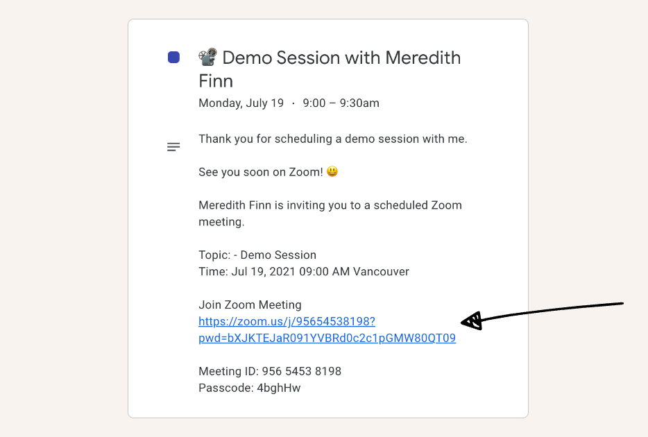 You want to look for scheduling apps that can automatically generate and include video conference links (for platforms like Zoom or Google Meet) in booking confirmations. When a client books an appointment, a meeting link is automatically generated and included in the confirmation email. This eliminates the need for back-and-forth emails to set up the meeting and reduces the risk of technical issues or confusion on the day of the appointment.