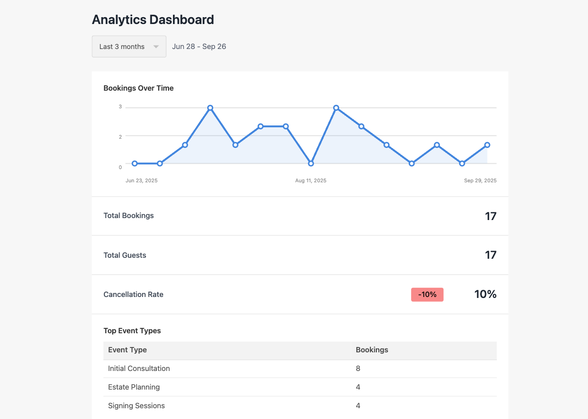When the dashboard shows your cancellation rate climbing, you can immediately adjust your reminder timing. When peak booking times reveal patterns, you can update availability with a few clicks. When event type data highlights your best-performing services, you can reorganize your booking page in minutes.