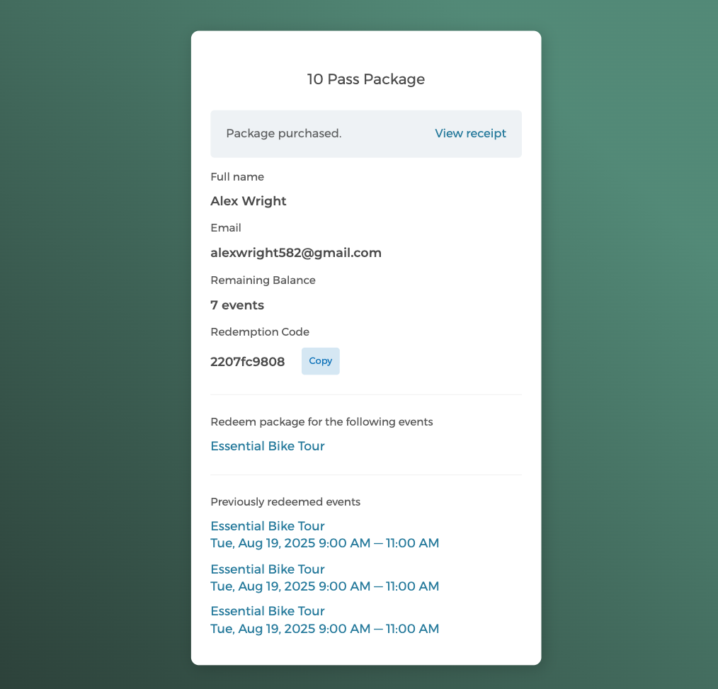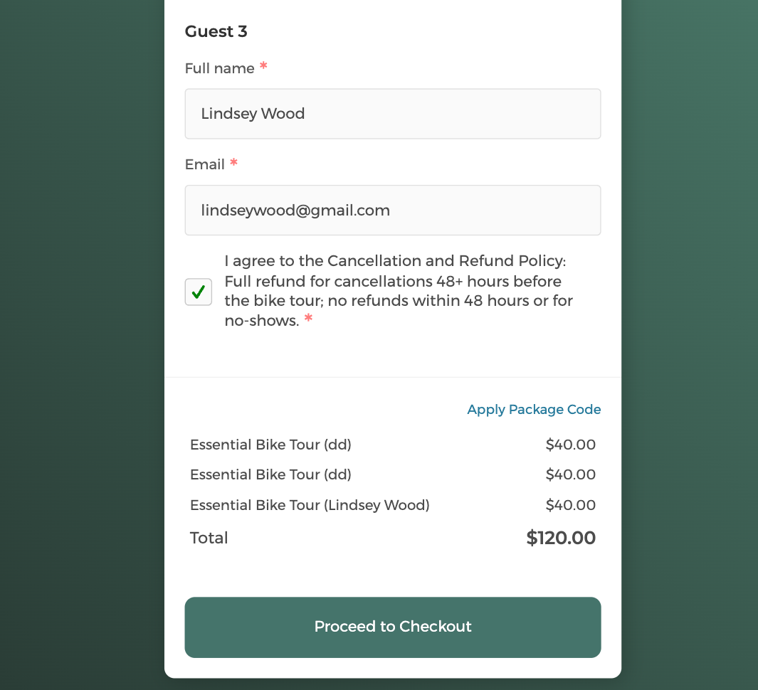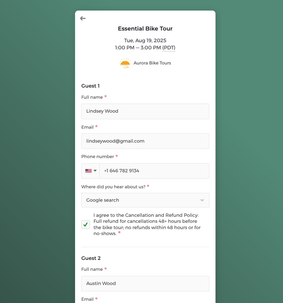 Wenn eine Familie von 3 Personen Ihre Fahrradtour bucht, bezahlen sie sofort für alle 3 Teilnehmer. Wenn Ihr Kurs 40 $ pro Person kostet, berechnet und belastet das System automatisch 120 $ für die gesamte Gruppenbuchung. Diese automatische Berechnung funktioniert unabhängig von Ihrer Preisstruktur, egal ob Sie pro Person abrechnen, Gruppenrabatte anbieten oder ein gestaffeltes Preismodell verwenden.