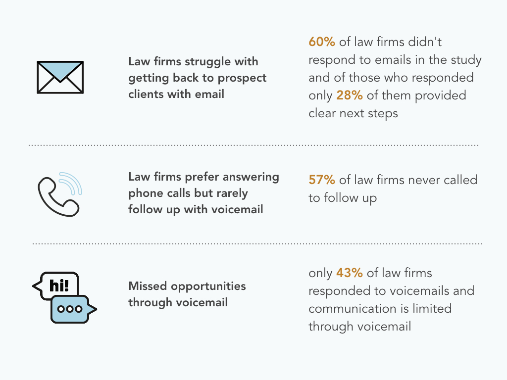 Todos entendemos que brindar una excelente experiencia al cliente es importante para que los negocios atraigan prospectos y construyan una base de clientes. Sin embargo, según el Informe de Tendencias Legales 2019 de Clio, los abogados no logran ofrecer comunicaciones de calidad a sus clientes. En un estudio realizado con 1,000 bufetes de abogados, la mayoría de ellos presenta deficiencias en la respuesta a correos electrónicos y mensajes de voz. Aunque los bufetes de abogados son más eficientes a la hora de contestar llamadas telefónicas, rara vez las devuelven. Y cuando encuentran tiempo para dar seguimiento, no proporcionan suficiente información por teléfono.