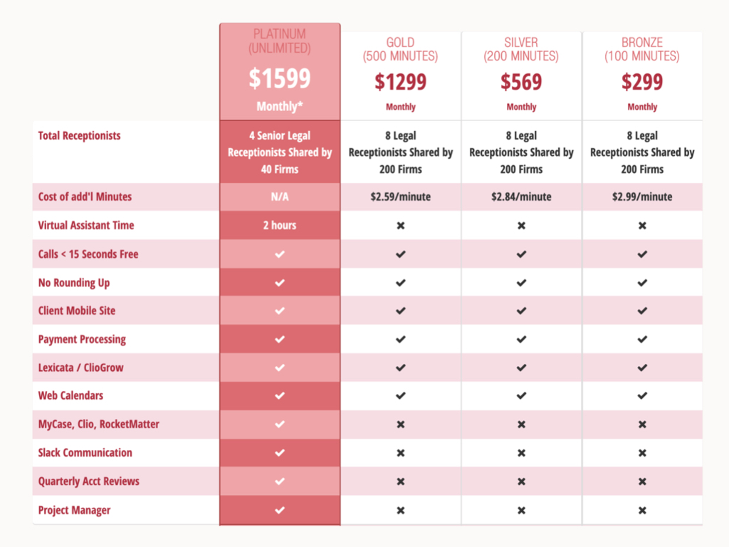 Precios más económicos: Muchas empresas de recepcionistas legales virtuales ofrecen planes de precios escalonados que satisfacen las necesidades de bufetes de abogados de diferentes tamaños. Back Office Betties es una empresa boutique de recepcionistas legales virtuales cuyos planes van desde el Bronze ($299/mes, 100 minutos) hasta el Platinum ($1,599/mes, minutos ilimitados). Si superas el límite de minutos de llamada de tu plan, simplemente cobran por minuto a partir de $2.59 por minuto. Si haces los cálculos, el costo de un recepcionista legal virtual es mucho menor que el de un recepcionista interno. Además, el modelo de pago mensual por suscripción te brinda la flexibilidad de cambiar tu plan fácilmente, por lo que no estás atado a un costo fijo.