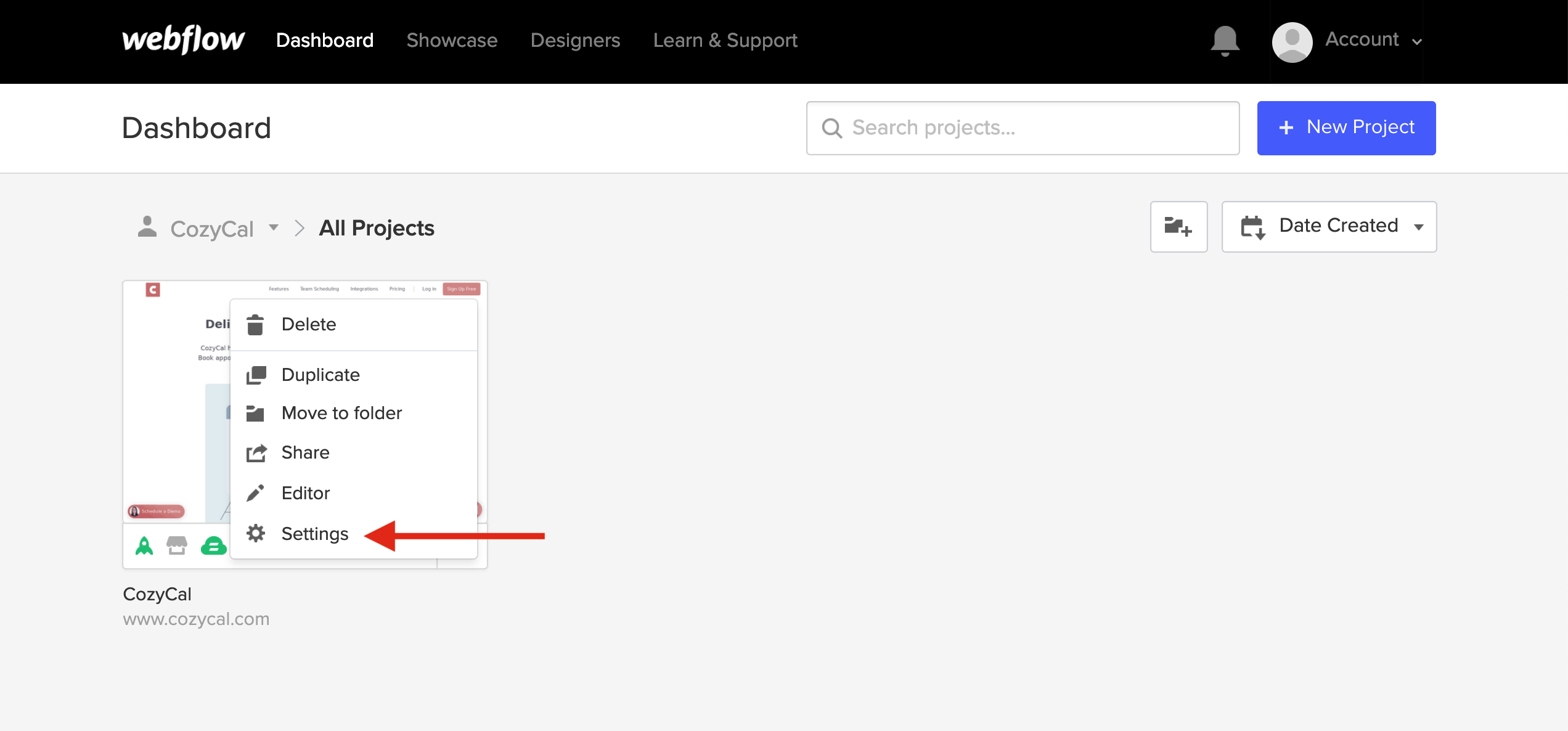 4. Connectez-vous à votre tableau de bord Webflow, puis dans la barre de navigation de gauche, cliquez sur Paramètres .