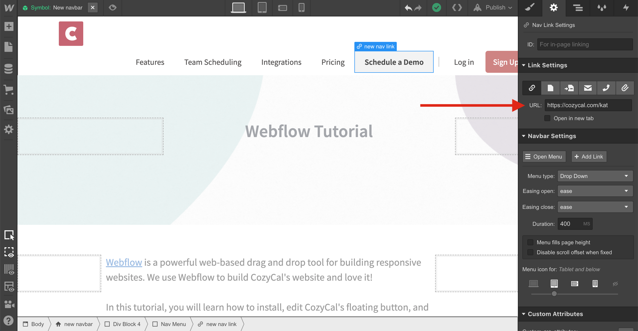Dans ce tutoriel, vous apprendrez à installer et modifier le bouton flottant de CozyCal, à utiliser votre propre bouton et à ajouter une intégration en cadre sur votre site Webflow.