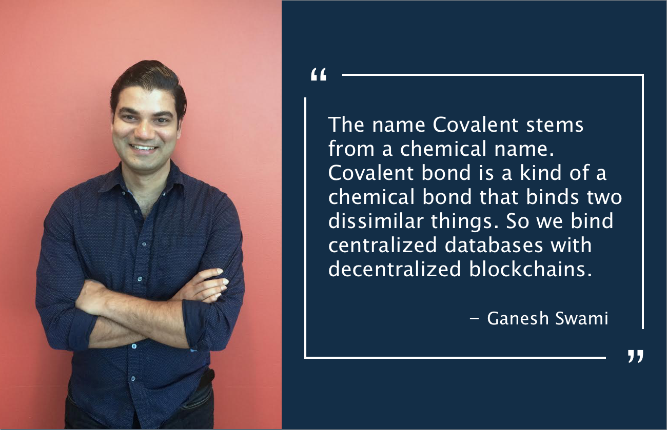 My guest today is Ganesh Swami , the co-founder of Covalent . Covalent is a tech company that  provides blockchain transaction data that cuts the noise and brings transparency to the cryptocurrency market. No matter which industry you work in, you must have heard about the emerging trend of blockchain, cryptocurrency and bitcoin. To people in the tech industry, some even claim that "it feels like the early days of the internet, web 2.0.", but to laypeople, blockchain is still a vague concept that is difficult to grasp.