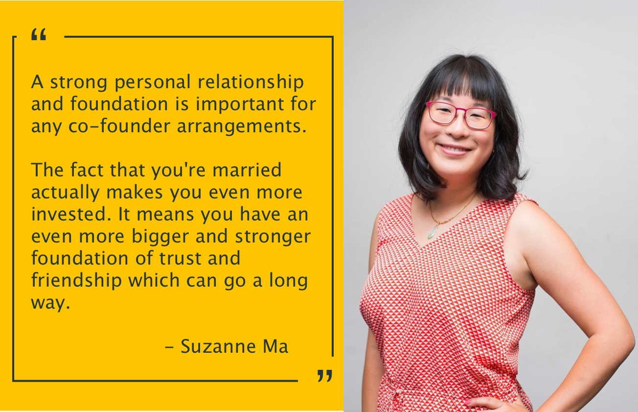 Suzanne: There are people who have strong opinions that maybe couple co-founders don't work. And I strongly disagree with that. A strong personal relationship and foundation is important for any co-founder arrangements. And the fact that you're married makes you even more invested. When stuff happens in the business or there is a miscommunication, it's very easy to forget to assume positive intent. You can get angry with your co-founder or have some kind of complicated misunderstanding. But when you're married, you have to assume positive intent. You've overcome other challenges in regards to your relationship and marriage. And so you can transfer all the results of those challenges into your life as a co-founder and that will only strengthen your relationship. Any co-founder relationship requires trust. And if you're married, it's a bedrock.
